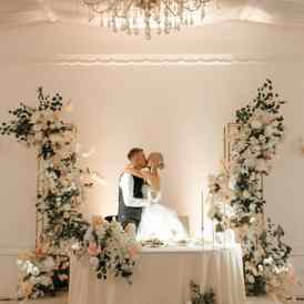 - Холл прекрасно подойдет под фуршет, здесь гости смогут угоститься аперитивом и закусками. Банкетный зал в белоснежных тонах, с высокими потолками и изящными люстрами вместимостью до 100 гостей оформлен декором с круглыми столами и президиумом и может стать подходящим местом именно для вашего торжества.